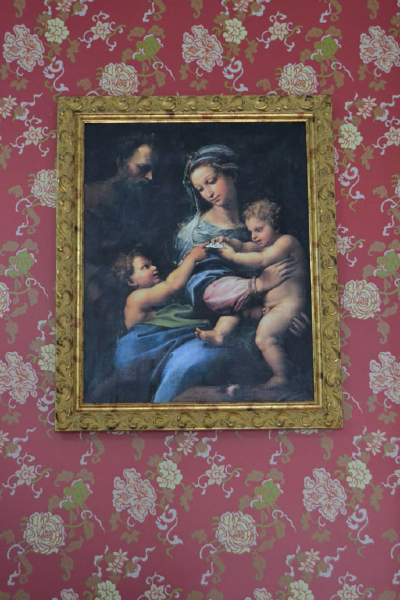 Utilização de papel de parede impresso a partir de um padrão com rosas. Reprodução da obra de Rafael – Virgem da Rosa – utilizando a Art On Demand.