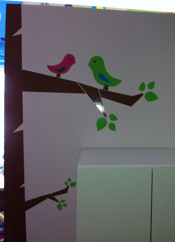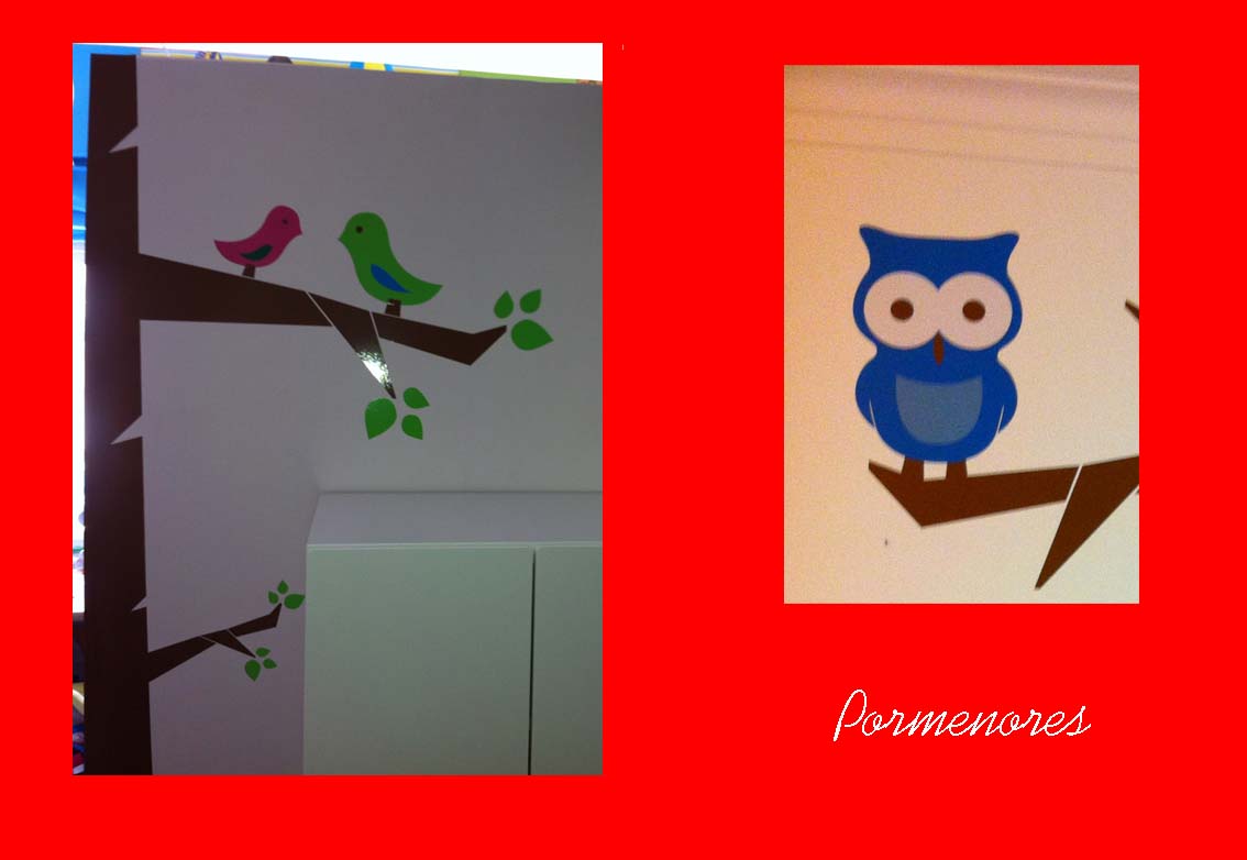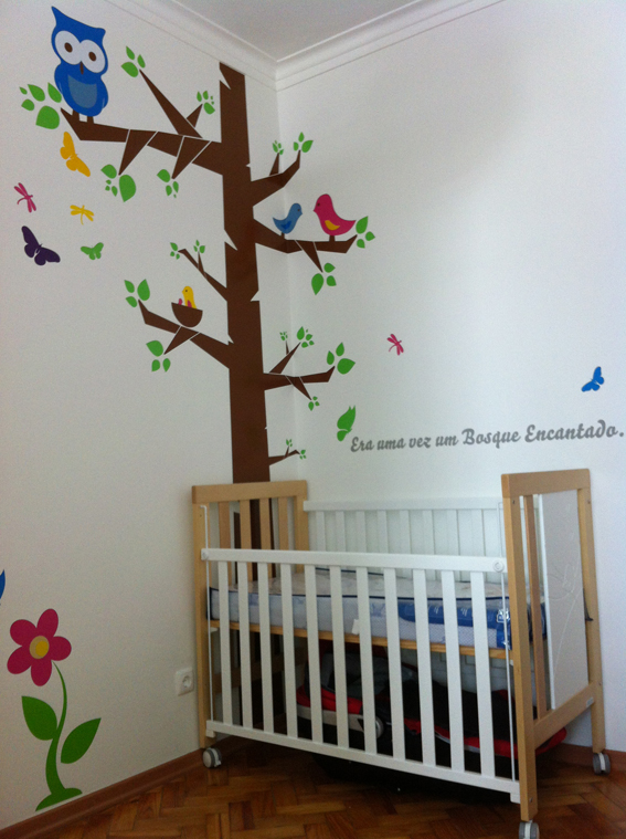 Quarto Criança Decoração de quarto de criança com motivos alegres, coloridos e a fazer parte de uma história… A Princesa do Bosque! Execução em papel de parede e vinil recortado.